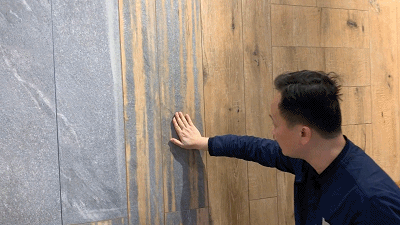 刚走进KT瓷砖,蔡老师和主持人就被墙面上的一款产品吸引了目光,这一款瓷砖的表面不仅有木纹,还夹杂有石纹,两种自然元素在同一款瓷砖上相映成趣。而这一款瓷砖正是KT瓷砖“木纹+”理念最好的展示。