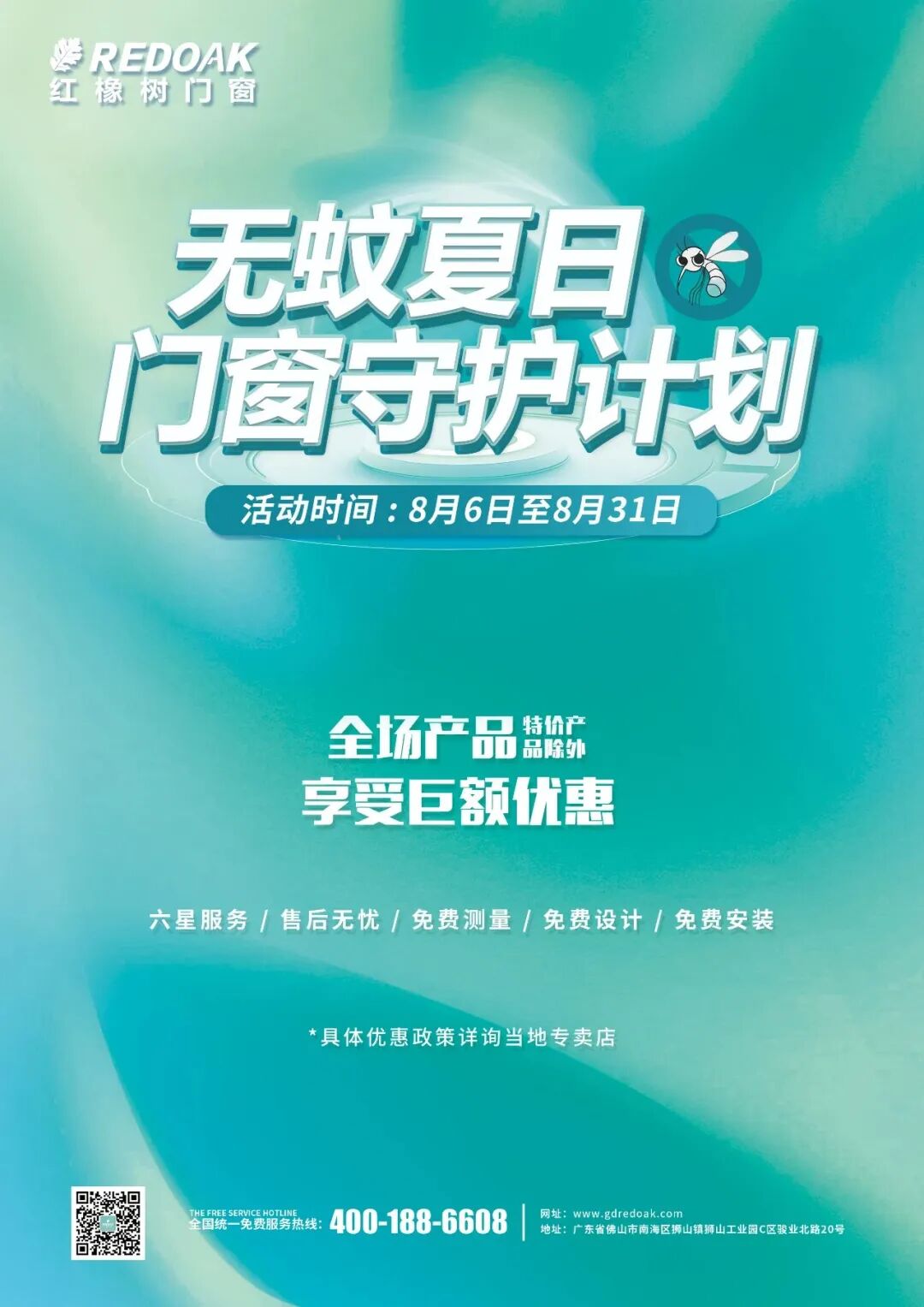 8月6-31日,红橡树门窗重磅推出【无蚊夏日 · 门窗守护计划】八月大促,到红橡树门窗终端门店即可获得超值选购价。